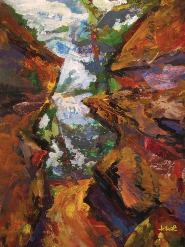 This collage began on the top of a mountain as a plein air experience. The crack between the two large rocks was wide enough to walk through. Once you pass between the rock walls the edge of the mountain meet the tops of the tall trees below.