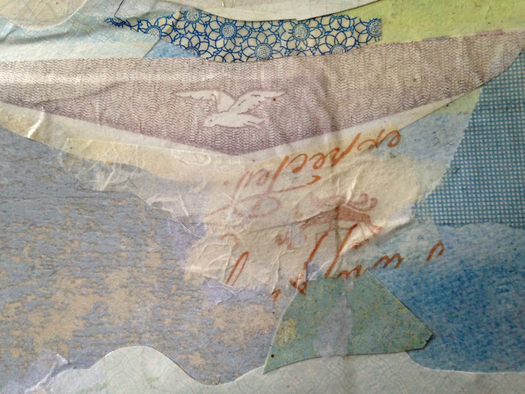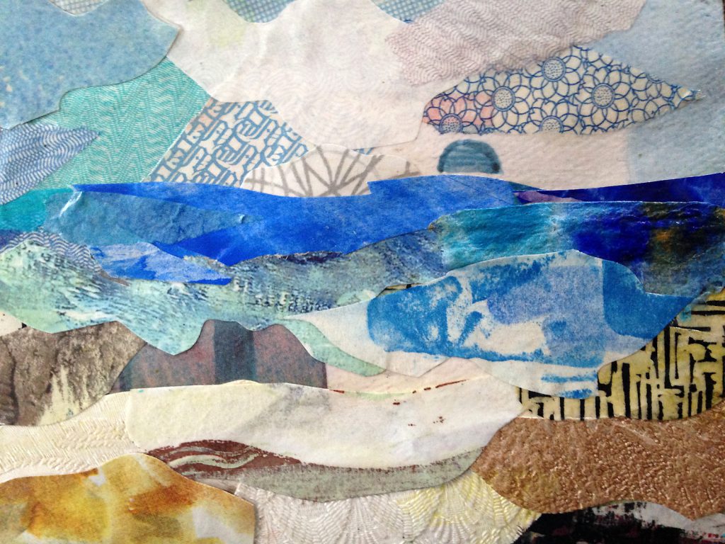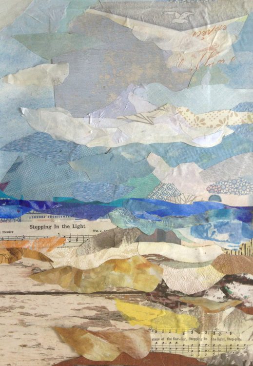 I used a pile of paper and turned it into sand and water. My many trips to the Outer Banks in North Carolina prepared me for this piece. I had a lot of fun using only paper instead of my usual mix of paper, paint and other materials.