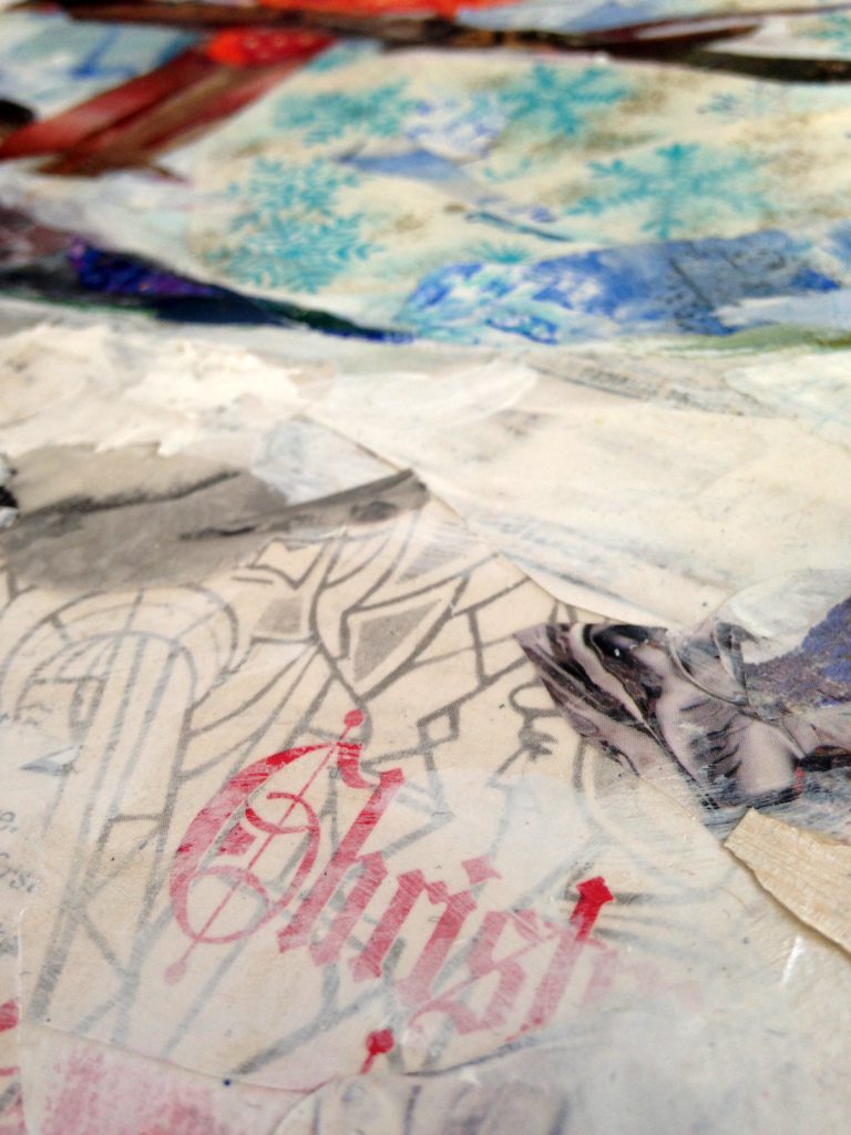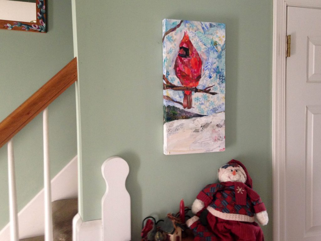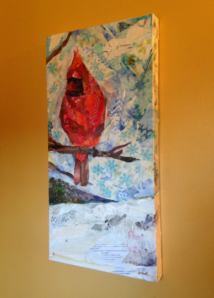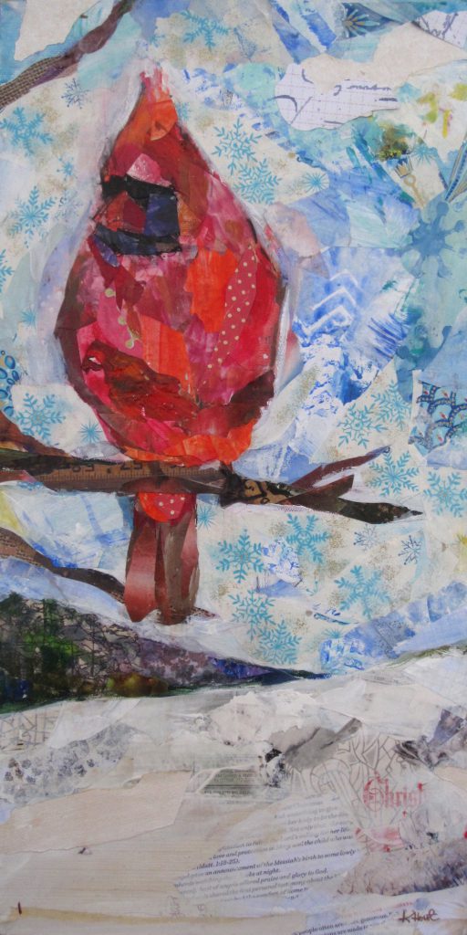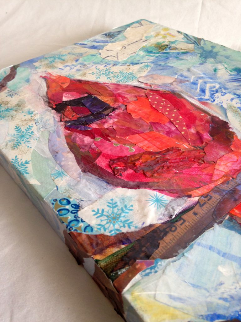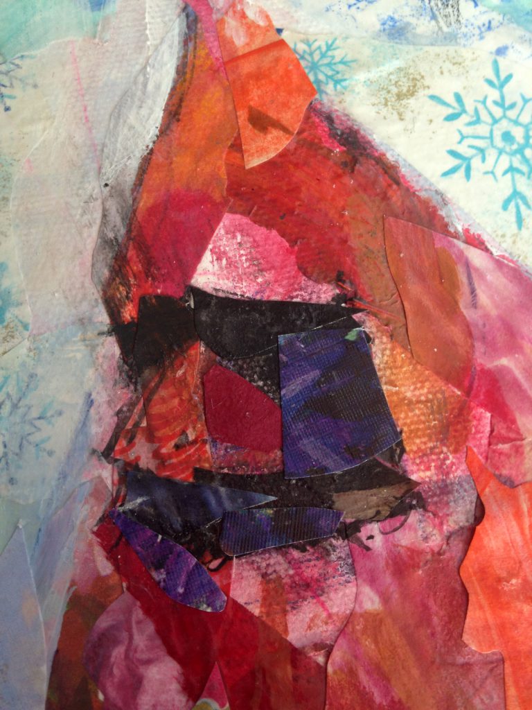 I went heavy on the texture with this collage. I found a roll of vintage Christmas paper that was my starting point. Though a snow scene, I included lots of color, including the bright pop of color the cardinal makes against the blue sky.