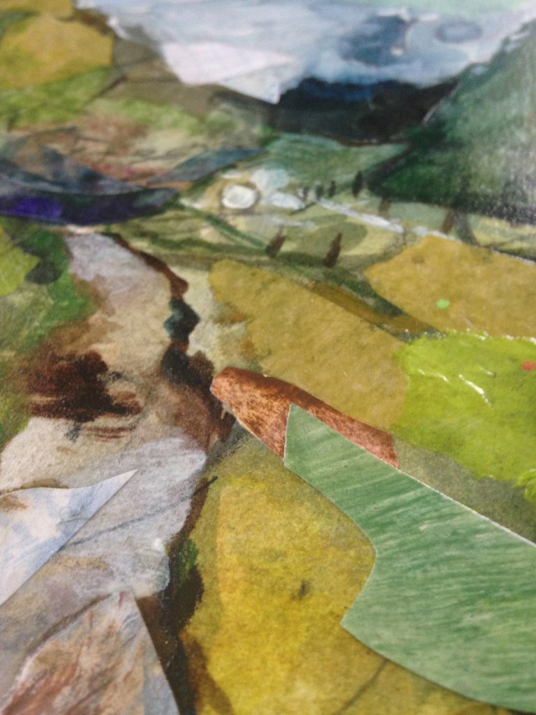 I was inspired to create a collage while staying at a historic bed and breakfast tucked between three mountains in West Virginia. I focused on keeping the colors soft and light and the patterns subtle.