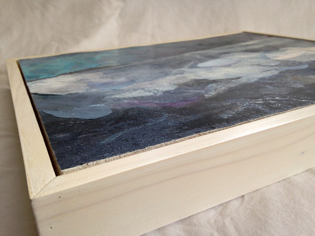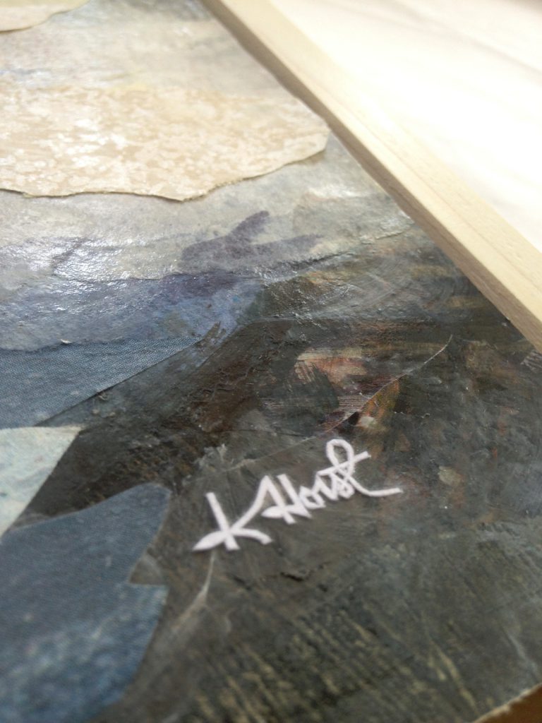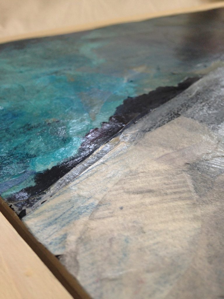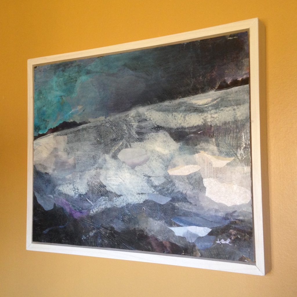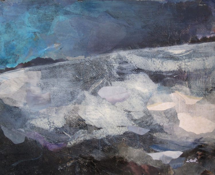 I had a dark monotype print from years ago. It was a perfect landscape on which to add the bright whites. It turned into a moody snow-covered night with the dabs of paint and clips of paper. The snow is dancing about and you have to sway along.