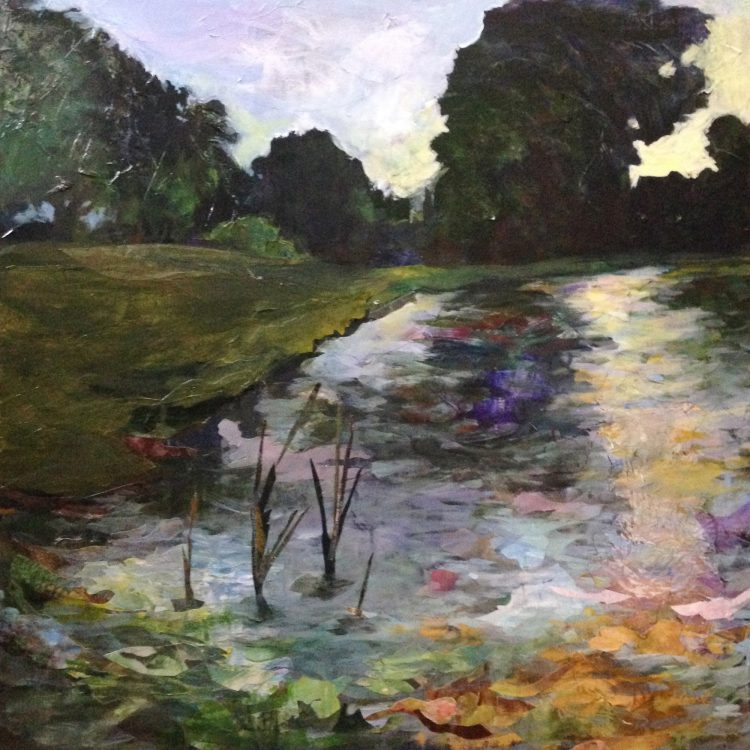 This collage displays a lovely sunset over my family's pond. I love how the dark trees are standing below the soft colors in the sky. I captured the slow movement of the water through the colors that have been absorbed from the landscape.
